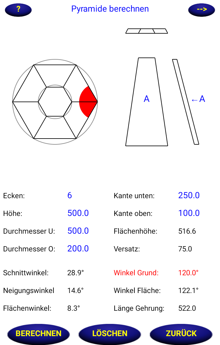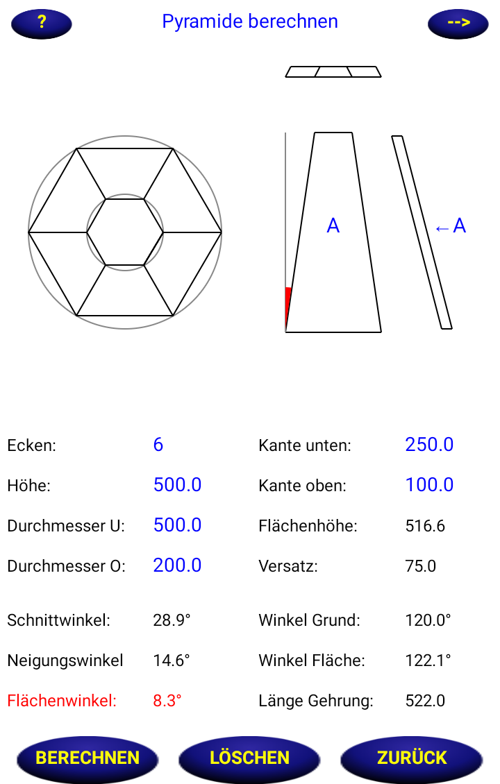 Hier wird dir der Flächenwinkel angegeben. In diesem Winkel werden die einzelnen Seitenteile geschnitten.